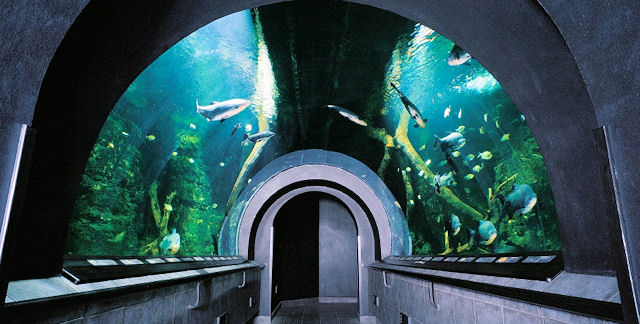 Points of interest: The volume of the exhibition tank is130,000 l water. The aquarium is5 m long and8 m wide. The height of the surface from the bottom is4.8 m. The view from the bottom of the pool is facilitated by a tunnel made of6.5 cm thick acrylate glass.